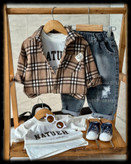 ست سهتیکه چهارخونه عید یه انتخاب شیک و خاص برای خوشتیپهای کوچولو شامل پیراهن چهارخونه پشمی ترک، شلوار جین گرم و تیشرت پنبه اعلا فوقالعاده باکیفیت و تضمینی مناسب عید، مهمونی و استایلهای خاص.